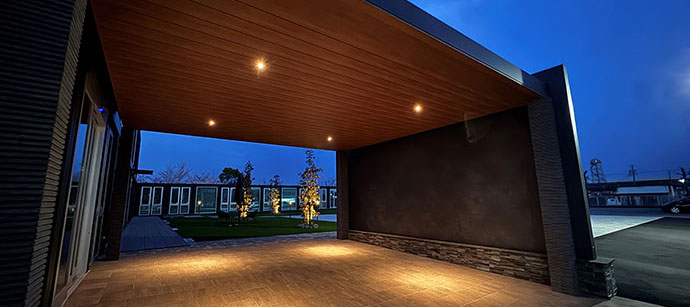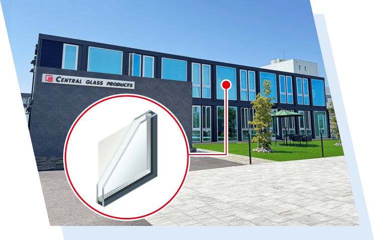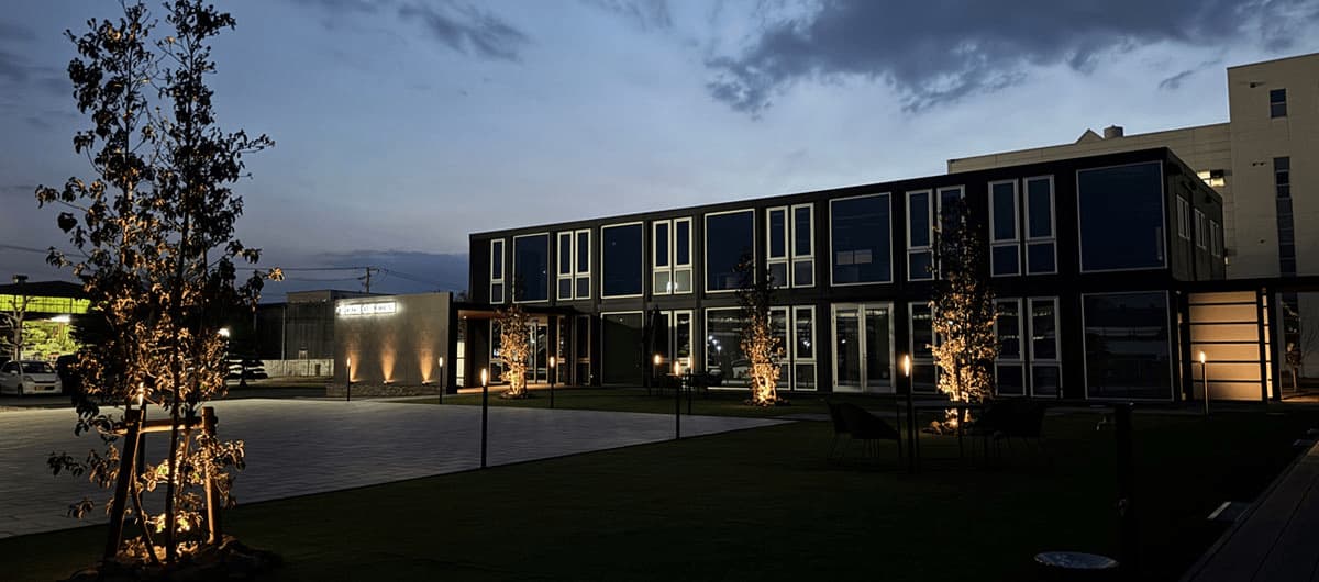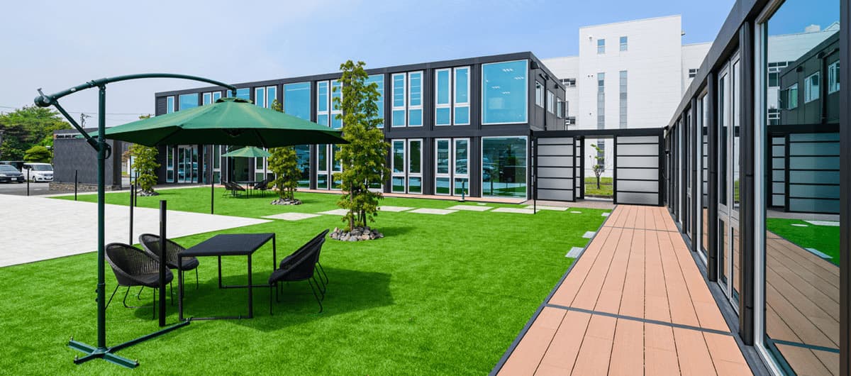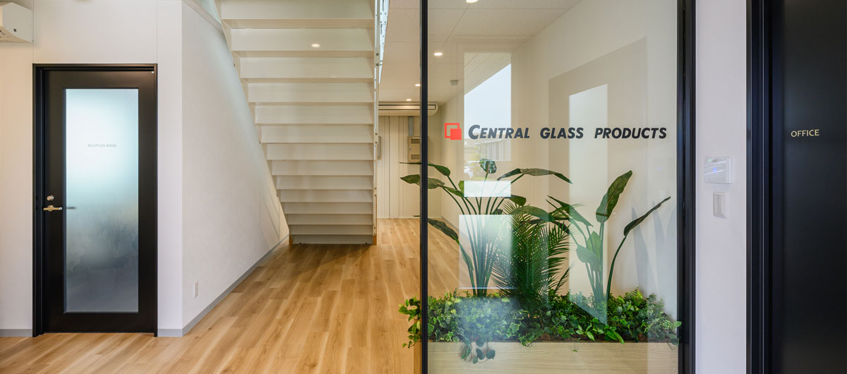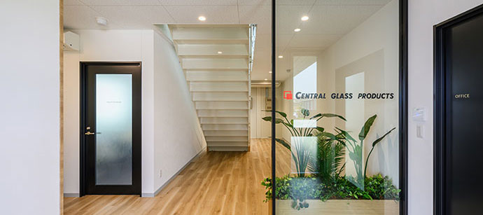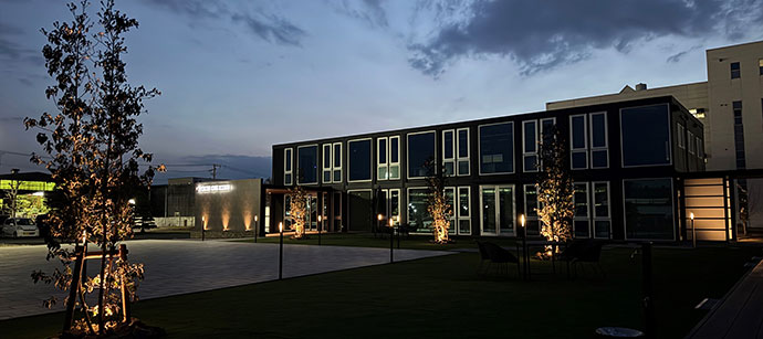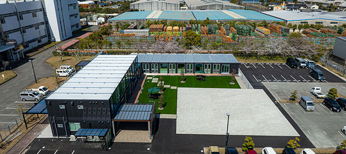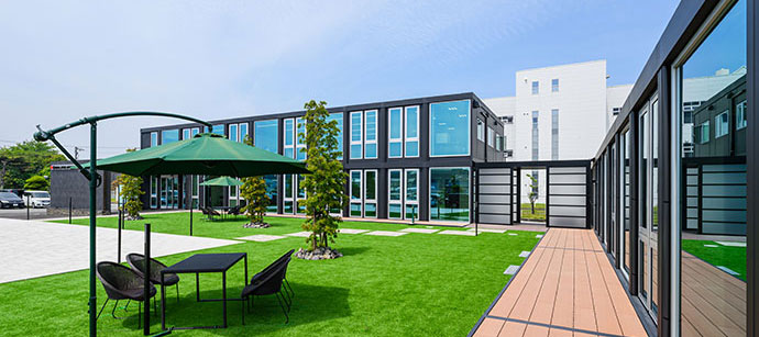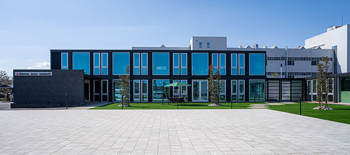 - 新社屋は、三協フロンテア様が提供するモバイルスペースを採用した事務所棟です。当社の製品「ルミナスブルー」を採用したガラス張りの美しい外観を実現しました。内装にはアイリスチトセ様の快適なオフィス家具を取り入れ、外構は森緑園様による緑豊かな景観とするなど多様な工夫を凝らした、働きやすい環境となっています。