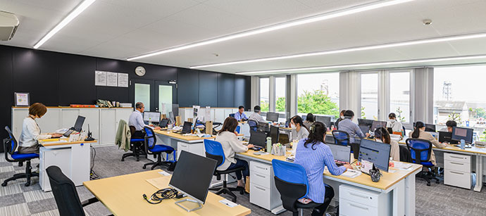 新しい本社社屋は、快適さと機能性を兼ね備えた最新の設備を整え、社員一人ひとりが安心して働ける空間となっています。明るく開放感のあるオフィスや多様なコミュニケーションスペースを設けることで、働きやすさと活気あふれる職場づくりを実現しています。