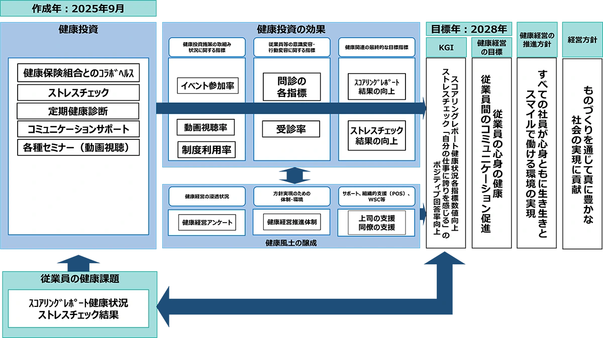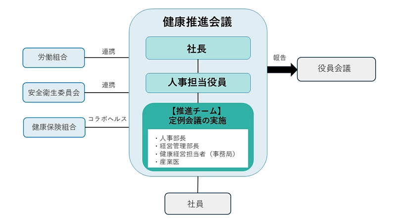 労働組合、安全衛生委員会、健康保険組合と連携し、健康経営の推進方針を審議、決定します。